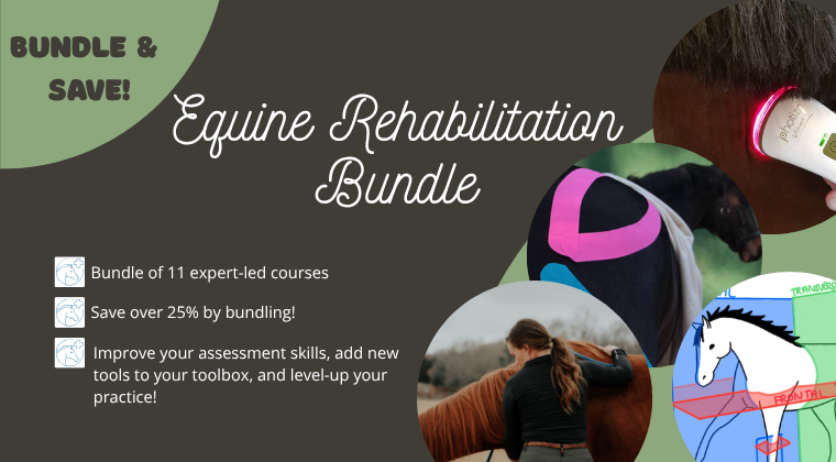 BundleGet 11 expert-led courses covering equine rehab theory, movement assessment, kissing spines, nutrition, kinesiotaping, red light therapy, and more. Build practical skills to support recovery, soundness, and performance in every horse you work with.